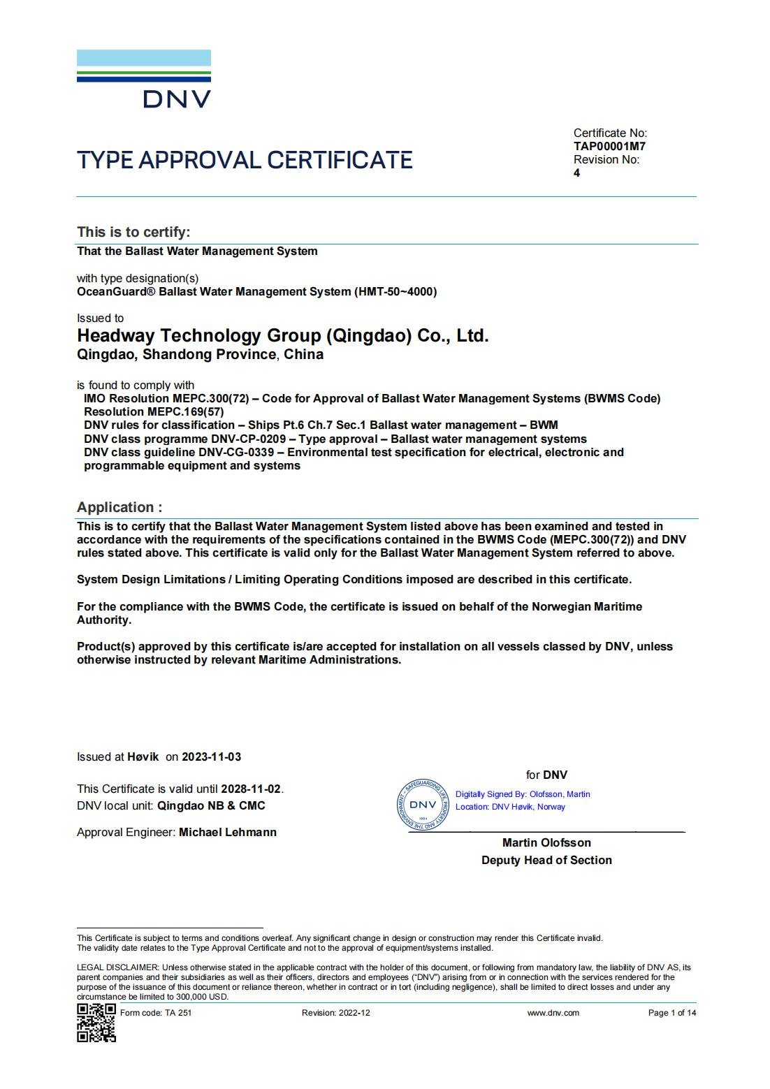 IMO BWMS Code 型式認可證書
