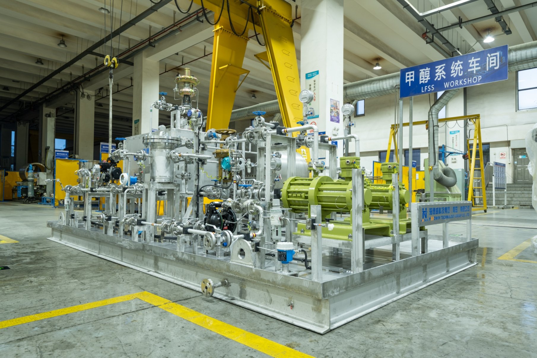 中船發(fā)動機有限公司大柴公司甲醇雙燃料試車平臺,配備了由海德威科技集團提供的涵蓋甲醇燃料供給模塊、加注儲存系 統(tǒng)、輔助換熱系統(tǒng)、氮氣系統(tǒng)以及控制安保系統(tǒng)等核心模塊在內(nèi)的一站式系統(tǒng)解決方案。該方案及其配套模塊由海德威自主 研發(fā)和生產(chǎn),是國產(chǎn)首個成功應用的甲醇燃料供給系統(tǒng)成熟解決方案。