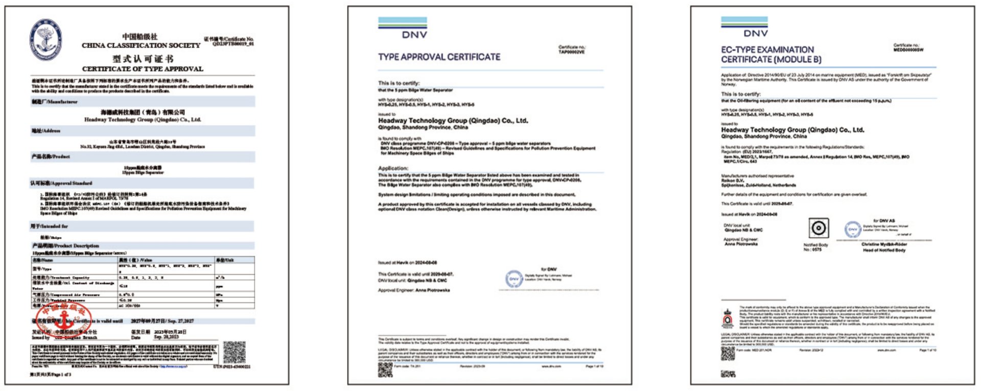 目前,海洋衛(wèi)士?艙底水分離器已取得CCS、DNV型式認可證書和EC認可證書。