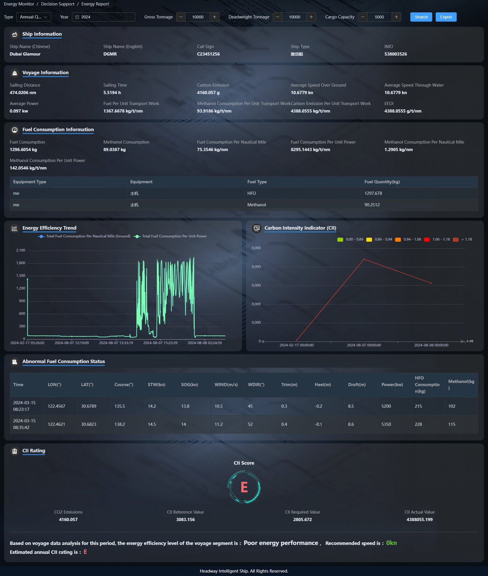 基于智能信息集成平臺,實時監(jiān)測船舶航行各個關(guān)鍵指標,運用現(xiàn)代化船舶能效管理的系統(tǒng)性方法,對船舶能源消耗、能源利用效率和二氧化碳排放進行嚴格的控制和管理,提高船舶能效,減少設(shè)備自身或人為因素造成的額外消耗,實現(xiàn)船舶節(jié)能減排的能效要求,推動航運綠色發(fā)展。